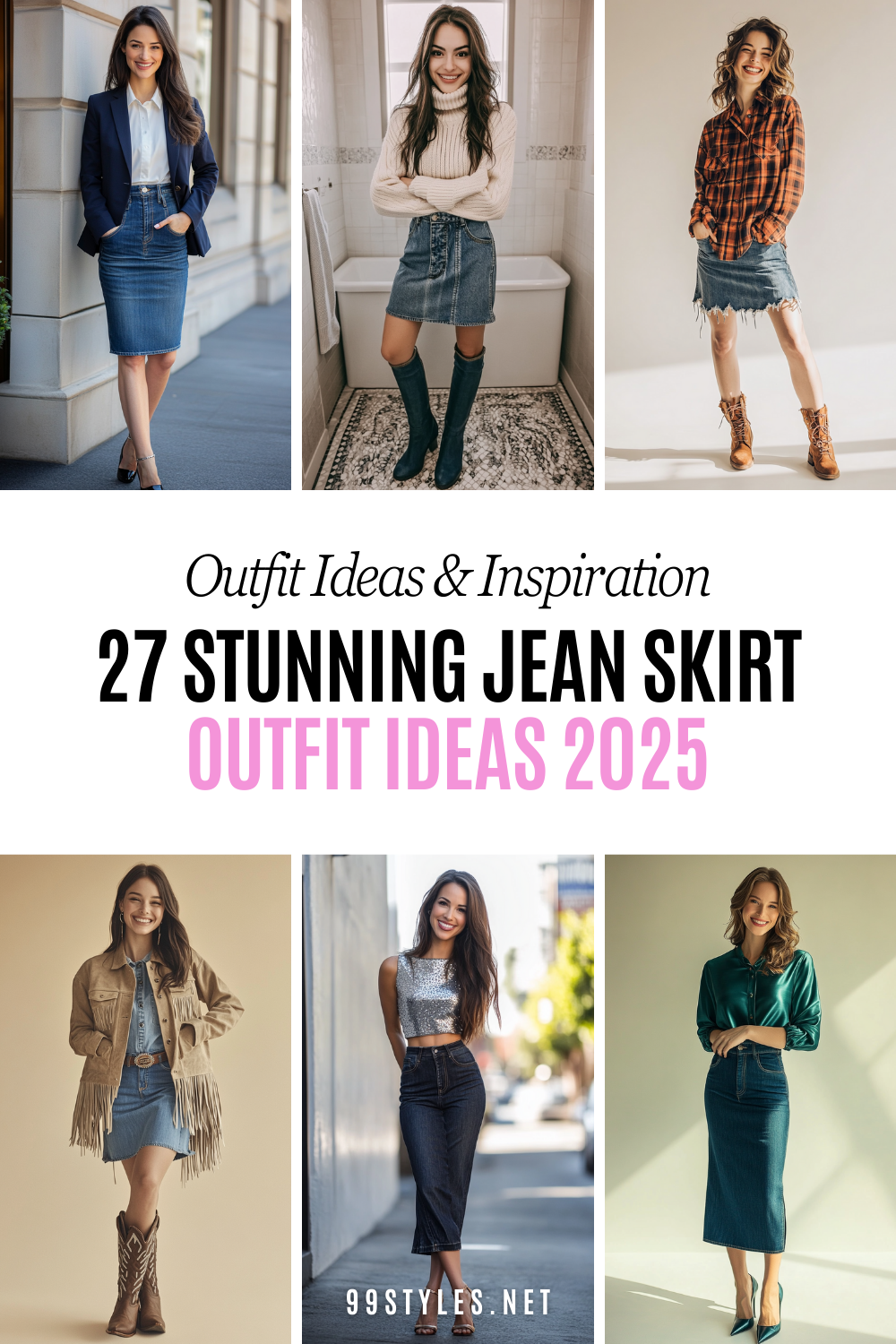 This year, layers, textures, and creative color combinations are taking denim skirts to the next level. Think blazers, oversized knits, structured coats, and even a little sparkle.